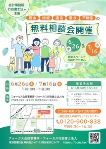 いつも弊社ホームページをご覧くださり、誠にありがとうございます。 6月・7月の個別相談会のお知らせです。 【日程】6月26日㈭・7月16日㈬ 午前10時~午後3時(各回50分 完全予約制) 【会場】フ ...