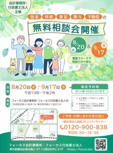 いつも弊社ホームページをご覧くださり、誠にありがとうございます。 8月・9月の個別相談会のお知らせです。 【日程】8月20日㈬・9月17日㈬ 午前10時~午後2時(各回50分 完全予約制) 【会場】フ ...